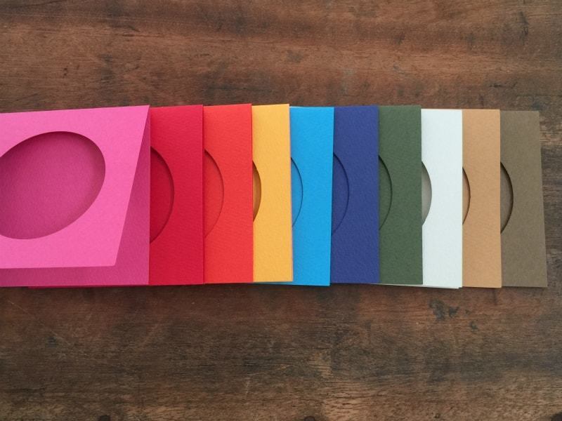丸い窓のついたような二つ折りのカラフルな10色のカード用紙をそれぞれ4枚ずつ、計40枚と、さらにたっぷりお得な期間限定カード増量セットです。
