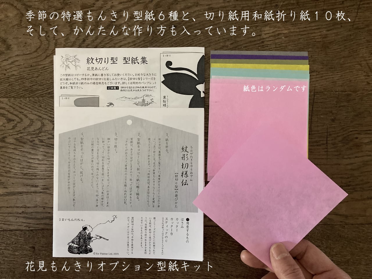 当ページのアイテム(「花見あんどん」が作れるセット)には、このほかに紋切り型紙(季節のセレクト六種)と色鮮やかな紋切り用和紙折り紙10枚などの「花見もんきりオプション型紙キット」も入っています。