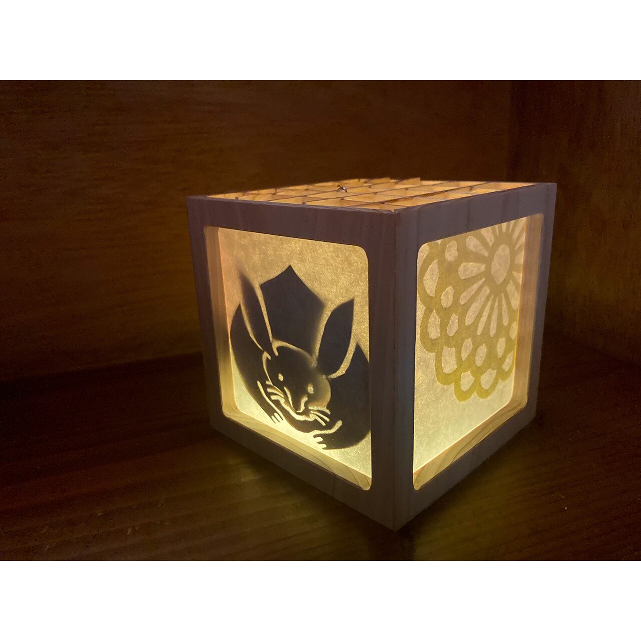 (動画で使用している紋切り型は、「真向き兎(向かって左)」と「九重菊(右)」。お月見の季節にもうれしい文様の組み合わせ例です。ゆらめきを強調するため、中に吊るした灯りを揺らした後に撮影しています。)